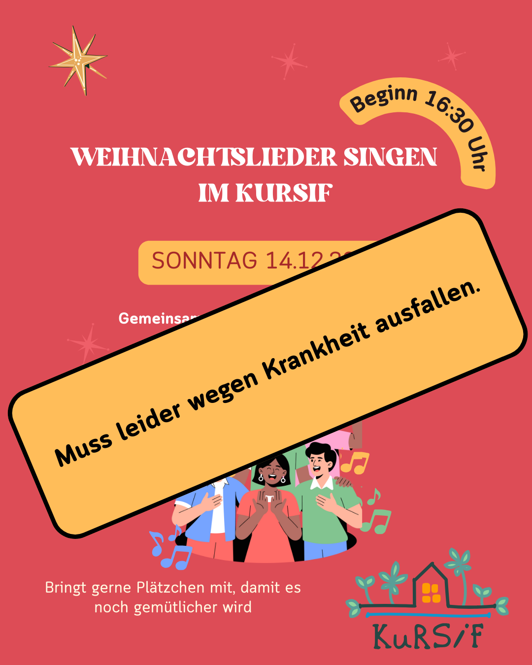 Aufgrund von Krankheit muss das Weihnachtslieder singen am 14.12 leider ausfallen. Wir wünschen euch allen trotzdem einen schönen 3. Advent und bleibt gesund oder werdet es wieder.