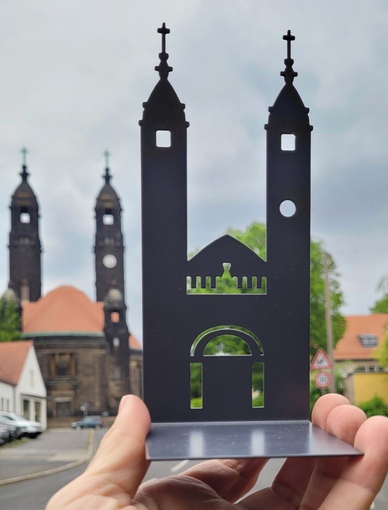 Unsere „KuRSiFis“ Thomas und Grit haben eine Buchstütze in Form der Dresdner Christuskirche designt. Die Idee dazu bekamen sie, als Thomas zu einem Geburtstag von einer Kölner Freundin Buchstützen des dortigen Doms geschenkt bekam. Dann fragten sie sich: „Könnte es sowas nicht auch von einer der ersten modernen Kirchen Deutschlands geben?“ Schließlich ist sie prägend für einen der schönsten Stadtteile Dresdens und in der Stadt fast so gut sichtbar wie die Frauenkirche.