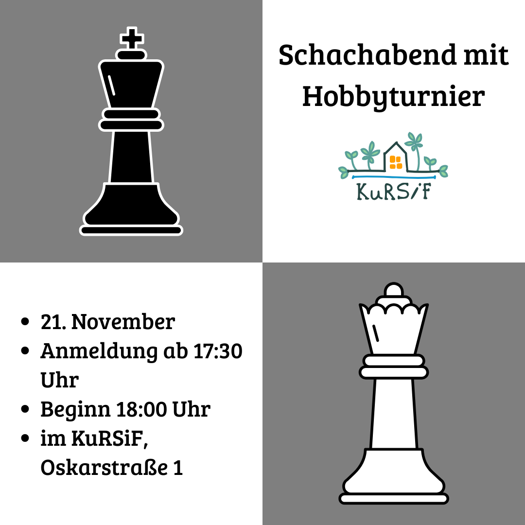 Perfekt, dann herzlich Willkommen bei unserem Schachabend im KuRSiF! Wir wollen Menschen mit Spaß am Schach versammeln und einen schönen Abend rund um das faszinierendste Brettspiel der Welt verbringen. Denn bei uns kannst du anders als bei Online Spielen deinen Gegenüber tatsächlich sehen und danach noch eine Runde mit ihm quatschen. 🤯
